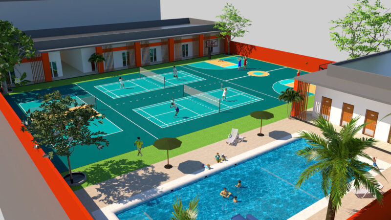 Khu thể thao là sự kết hợp hài hòa giữa công năng sử dụng, cảnh quan xanh mát và không gian mở, tạo nên một môi trường thể chất lý tưởng trong lòng đô thị. Khu vực được quy hoạch gồm ba phân khu chính: cụm sân thể thao liên hoàn, hồ bơi tiêu chuẩn, và dãy phòng chức năng phục vụ hậu cần và nghỉ ngơi.