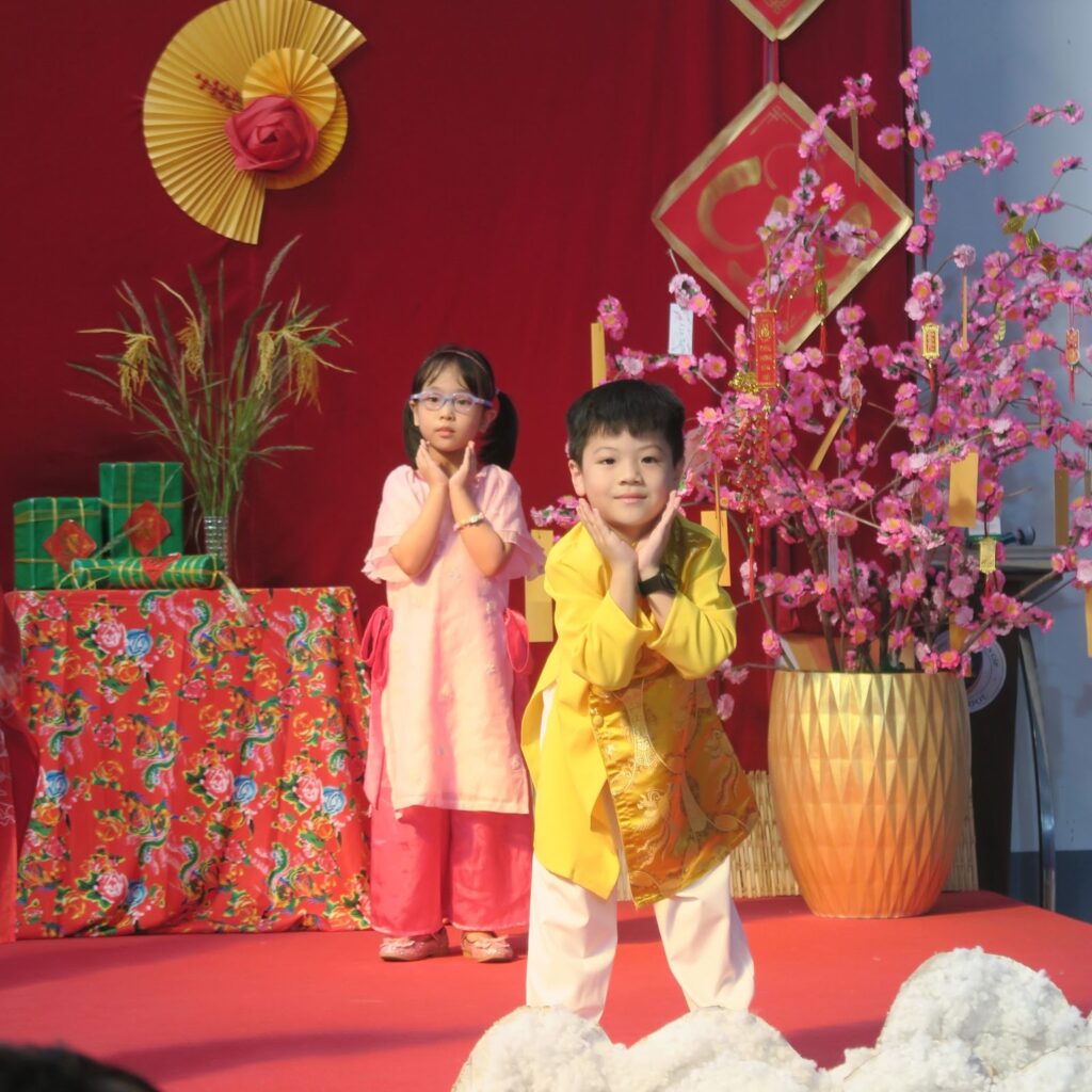 Khối Tiểu học đã khiến cả sân khấu vỡ òa với vở kịch “Ai mới là Tết”. Với lối diễn xuất tự nhiên, tự chủ, các bạn nhỏ đã khéo léo kể câu chuyện về ý nghĩa thực sự của ngày Tết. Qua đó, thông điệp về sự gắn kết gia đình được truyền tải sâu sắc: Tết không chỉ ở bánh trái, Tết gõ cửa khi chúng ta ở bên nhau, cùng dọn dẹp nhà cửa và quây quần bên mâm cơm tất niên.